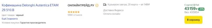 Обычно такие кофемашины стоят под 60 тысяч рублей, но сейчас на Яндекс Маркете топовую De’Longhi Autentica можно урвать всего за 43 563 рубля. Также не забывайте про кэшбек, которые некоторые банки готовы отсыпать за покупки на этой платформе.