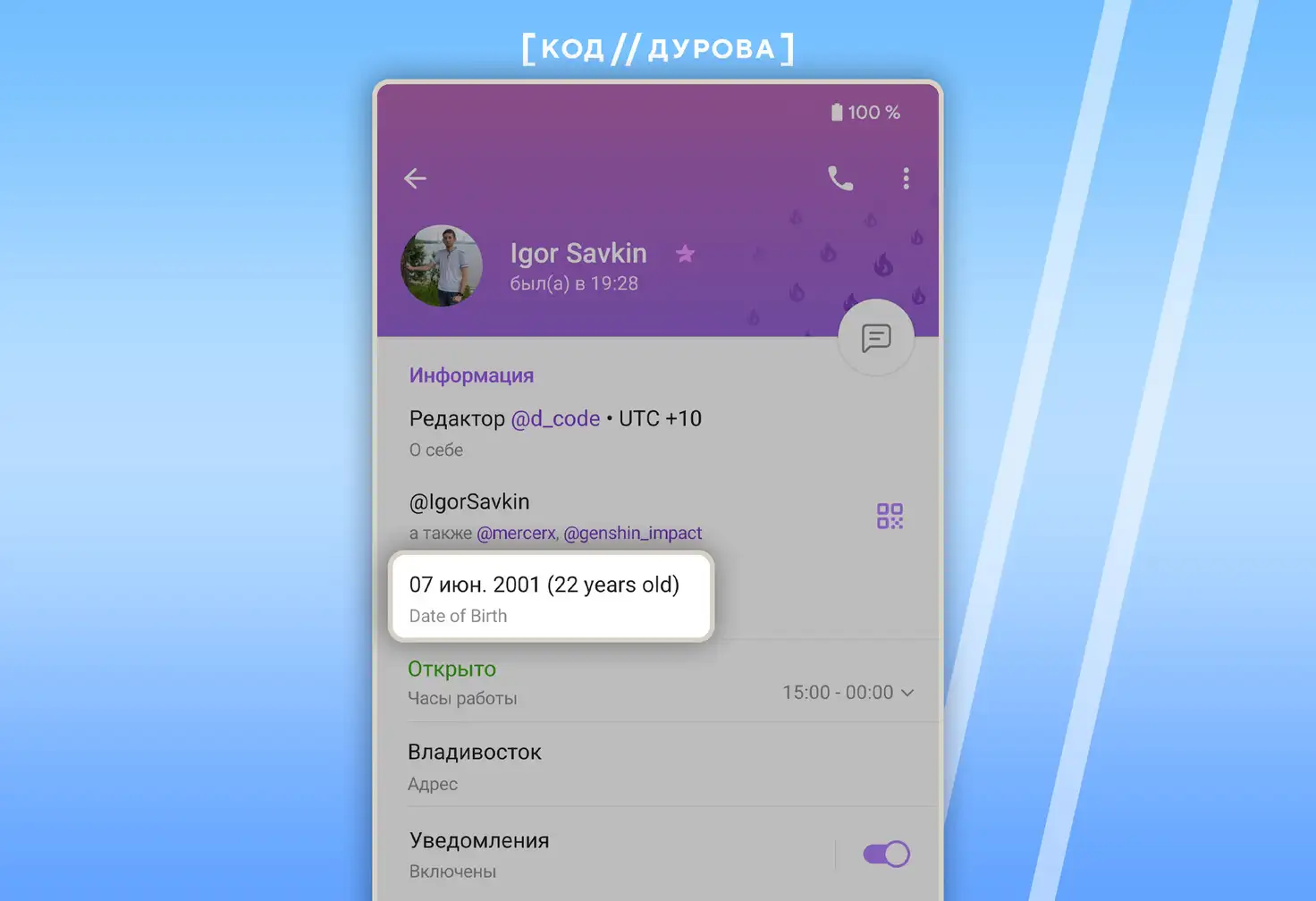 Пользователь сможет указать на странице профиля дату рождения. Вероятно, это еще не все — ждем, когда Дуров решит вернуть стену, раздел с интересами, музыкой и видеозаписями.