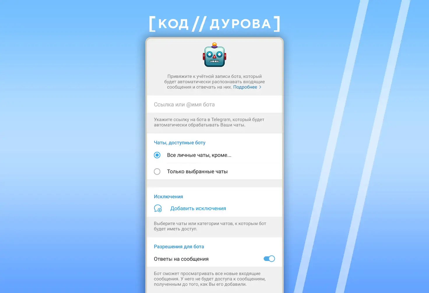 Юзеры смогут подключить чат-бота, который будет отвечать за них другим пользователям. Скорее всего, эта опция станет частью апдейта «Telegram для бизнеса».