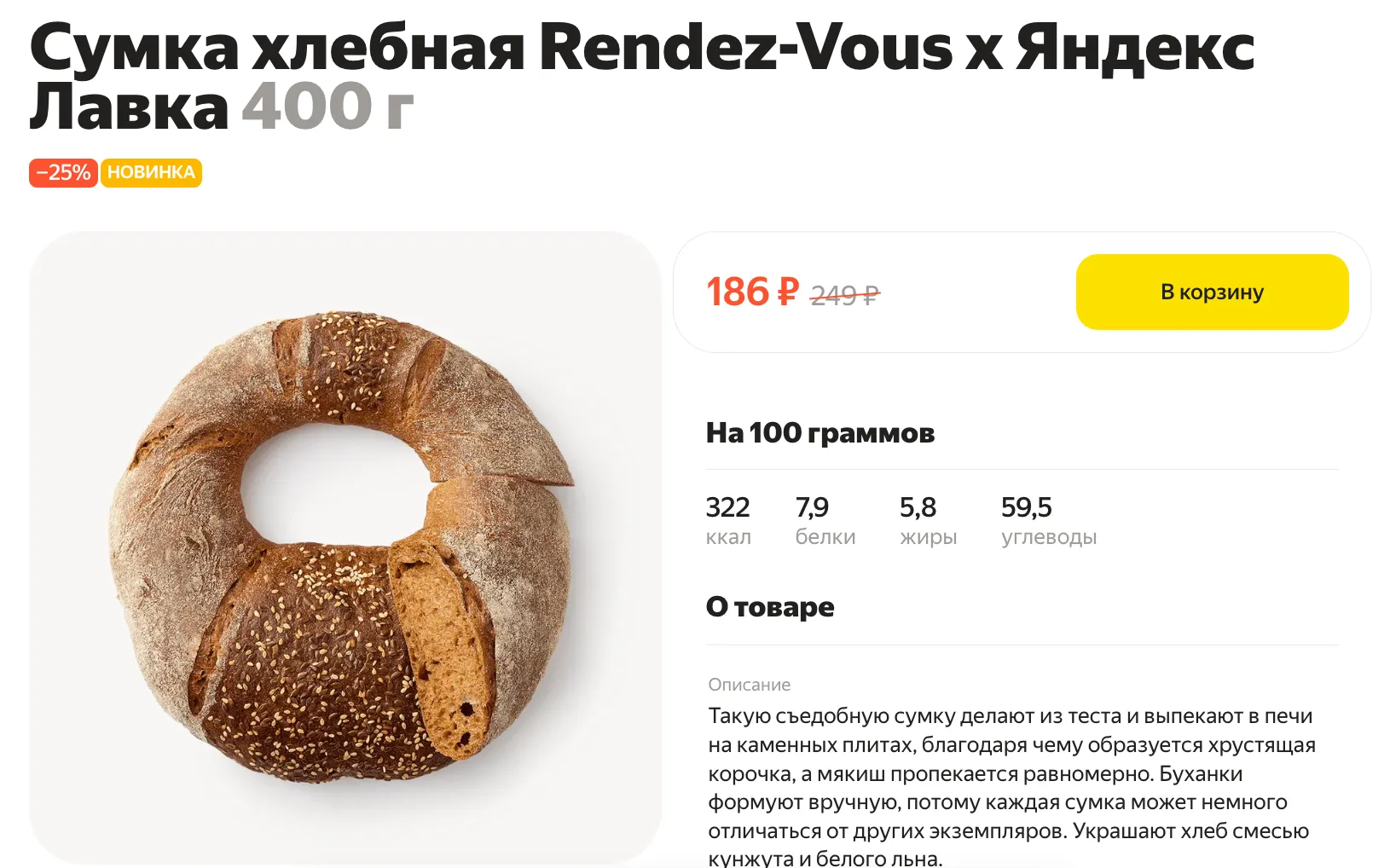 «Яндекс Лавка», вероятно, в честь 8 марта выпустила коллаборацию совместно с модным брендом Rendez-Vous. В ассортименте торговой площадки появилась хлебная сумка.