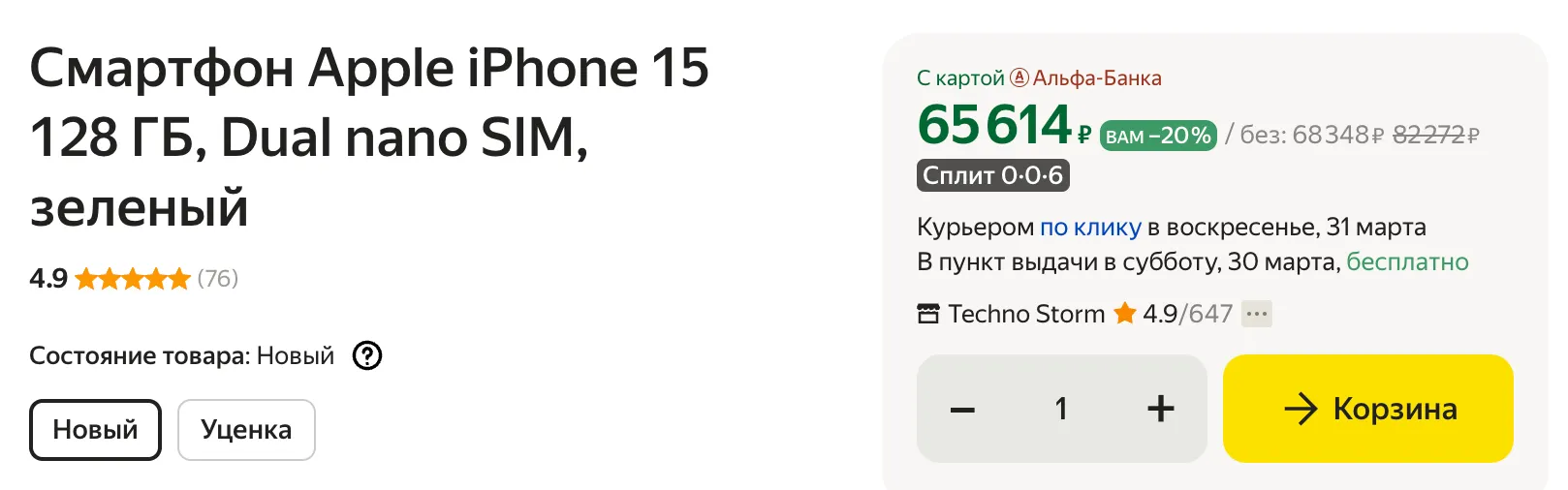 Например, стартовый iPhone 15 сейчас можно схватить по самой низкой цене — за 68 тысяч рублей. Если оплачивать картой «Альфа Банка» или через «Яндекс Пэй», то девайс обойдется в 65 614 рублей.