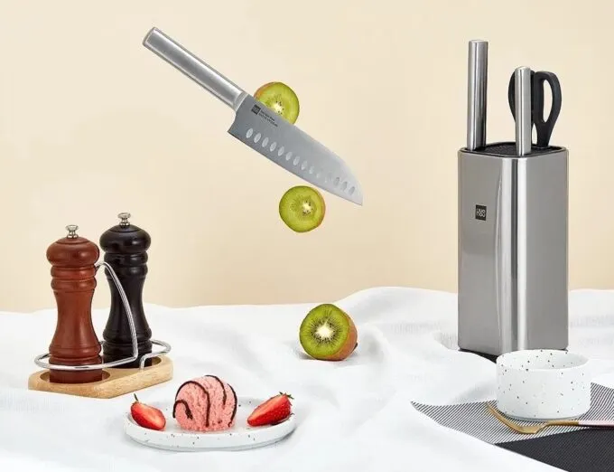 К качеству тут нет никаких претензий. Xiaomi не стала экономить на материалах. Ножи, ножницы и подставка выплавлены из нержавеющей стали 30Cr13. Причём в ножах вообще нет швов, поскольку лезвие выступает продолжением ручки. Соответственно, в них тупо нечему ломаться. Также производитель специально сделал полые рукоятки, чтобы девайсы весили меньше и ими было удобнее орудовать.