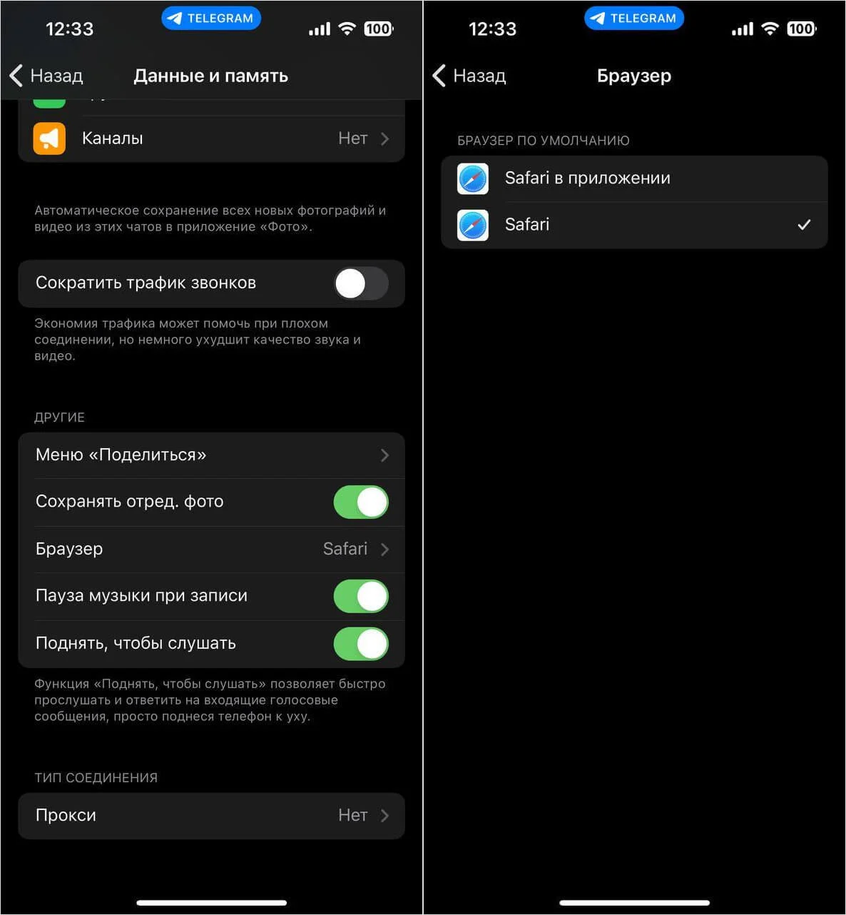 Ссылки в телеграме по дефолту открываются во встроенном браузере. Но можно сделать так, чтобы телеграм запускал полноценную версию Safari. Снова заходим в раздел «Данные и память», затем находим «Браузер» и ставим флажок напротив выбранного браузера.