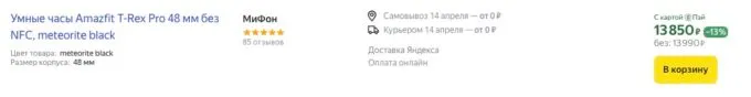 Прямо сейчас на Яндекс Маркете бомбовые Amazfit T-Rex Pro можно купить всего за 13 990 рублей. Также не забывайте, что многие банки готовы отсыпать щедрый кэшбек за покупки на этой платформе.