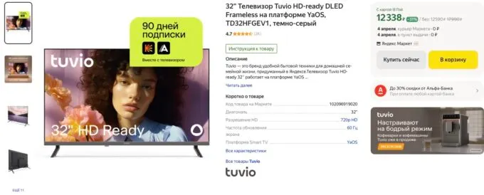 Прямо сейчас Tuvio DLED Frameless TD32HFGEV1 можно урвать на Яндекс Маркете за 12 590 рублей и кэшбекнуть до 30% при оплате картами некоторых банков (так он обойдётся в ~9 тысяч рублей) или разбить покупку в Сплит.