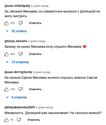 Если вы зайдете в комментарии под любым выпуском «Культурного кода», то непременно обнаружите тонны залайканного хейта в адрес Алены. Поклонники современной версии Минаева считают, что Долецкой не место на его ютуб-канале, а все выпуски (обо всем на свете) должен вести только один человек. Имя ему Сергей Сергеевич. Честно говоря, от таких комментариев уже мерзко.