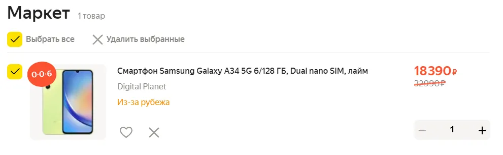 Пожалуй, прямо сейчас Galaxy A34 — лучший бюджетник на рынке. Но мы уверены, что скоро запасы устройства закончатся, поэтому медлить с покупкой нельзя. На Маркете «ашку» отдают всего за 18 390 рублей — правда, такая цена актуальна только для лаймовой расцветки гаджета, да и доставка осуществляется из-за рубежа. Таможенной пошлины, конечно, не будет, но меньше чем за неделю смарт до вас не дойдет. Если на этот нюанс плевать, скорее забирайте «тридцать четвертый».