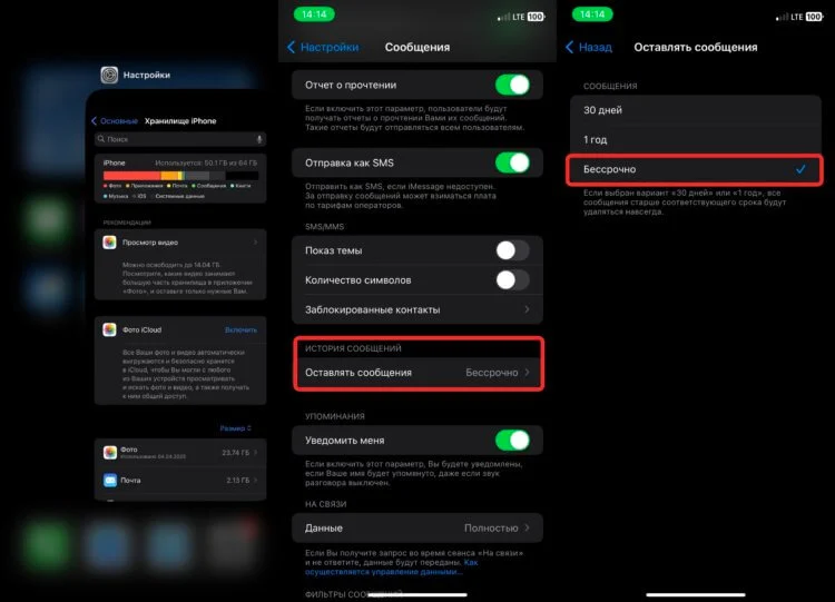 Далее переходим в раздел «Сообщения» в настройках. Здесь нужно установить параметр «Бессрочно» в пункте «Оставлять сообщения».