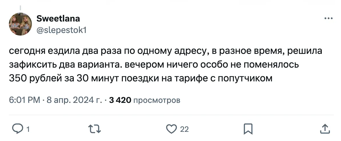 Тариф «Вместе» — совместные поездки — появился в «Яндекс Такси» в конце 2022 года. Блогерша под ником @slepestok1 выяснила, что с ним можно здорово сэкономить.