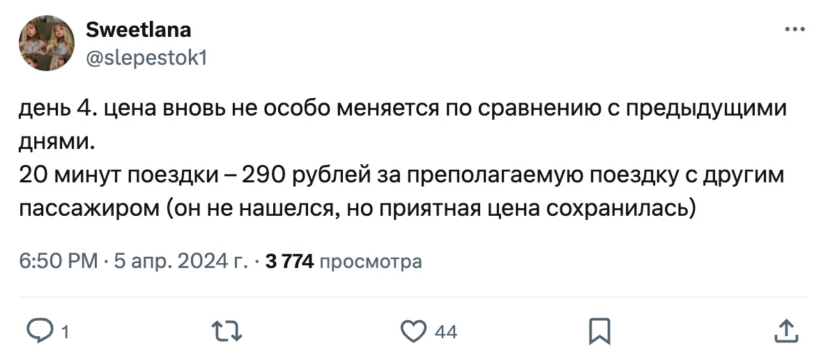 Уже на второй день блогерша начала пробовать совместные поездки. И стала заметно экономить. Стоимость поездок с попутчиком в разные дни составила 285, 290, 300, 304, 350 и 320 рублей. Исключением оказалась совместная поездка, которая обошлась в 560 рублей, но в этот день лил сильный дождь.
