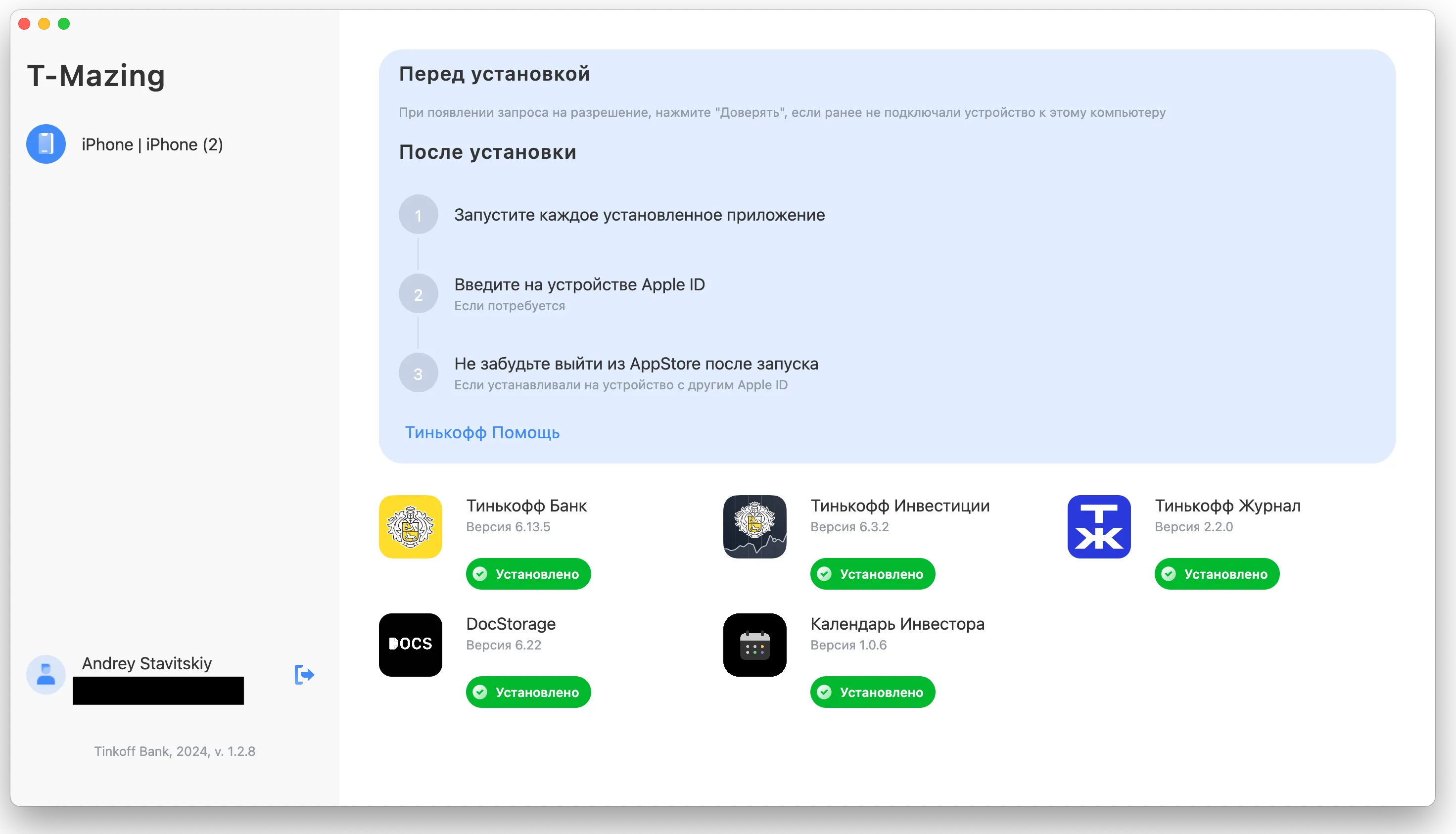 Приложение по сути не отличается от iMazing — популярной программы для установки программ на iPhone. Оно значительно проще, но заточено только под приложения «Тинькофф». Например, «Сбербанк.Онлайн» через T-Mazing установить нельзя.
