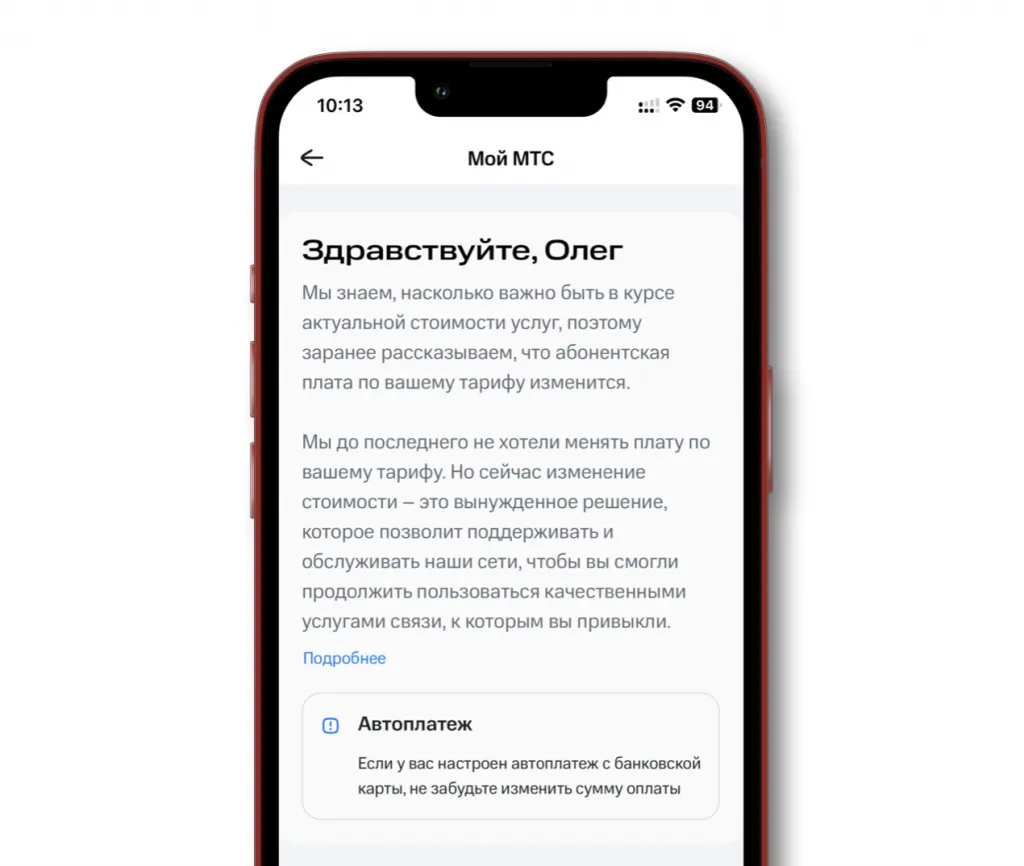 Также нет их и в мобильном приложении МТС. Там просто висит плашка, что с определенной даты платить за связь и интернет придется больше.