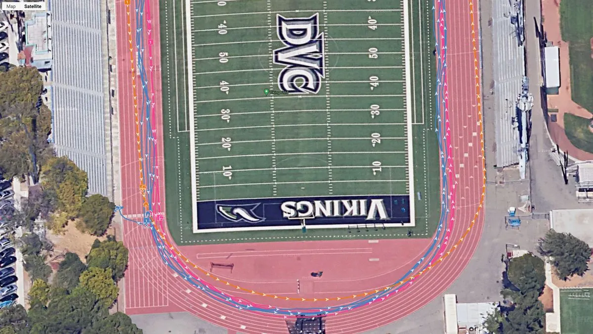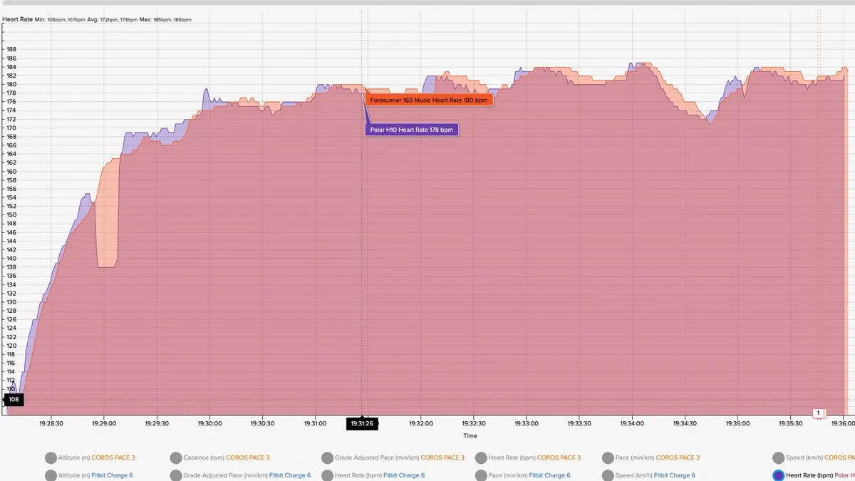 При замере точности GPS часы показали, что могут точно строить траекторию маршрута. Например, на картинке ниже видно, что соответствующая Garmin Forerunner 165 линия (розовый цвет) постоянно оставалась на треке. Автор заключил, что функция определения локации в этих бюджетных часах работает лучше, чем во многих дорогих устройствах других брендов.