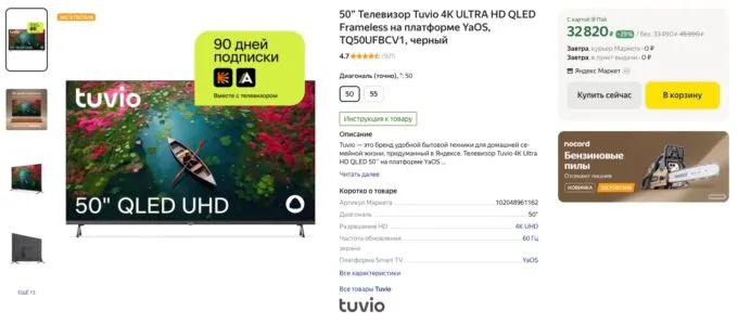 Заметили, что на Маркете один из топовых смарт-телевизоров Яндекса сильно просел в цене. Речь идёт о шикарной модели Tuvio с 50-дюймовым дисплеем QLED, полным набором умных функций и голосовым управлением через Алису. Если на старте этот девайс стоил под 50 тысяч, то сейчас его можно купить всего за ~30 тысяч рублей.