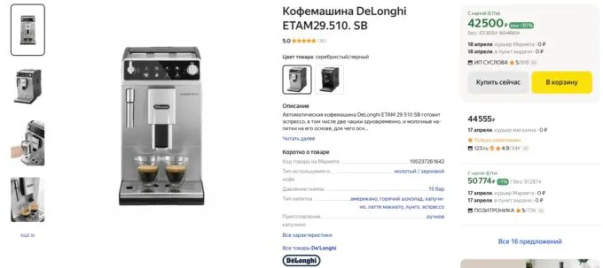 Обычно за такие кофемашины просят больше 60 косарей, но сейчас на Яндекс Маркете топовую De’Longhi Autentica можно купить всего за 43 370 рублей. Также не забывайте про кэшбек, которые некоторые банки готовы отсыпать за покупки на этой платформе.