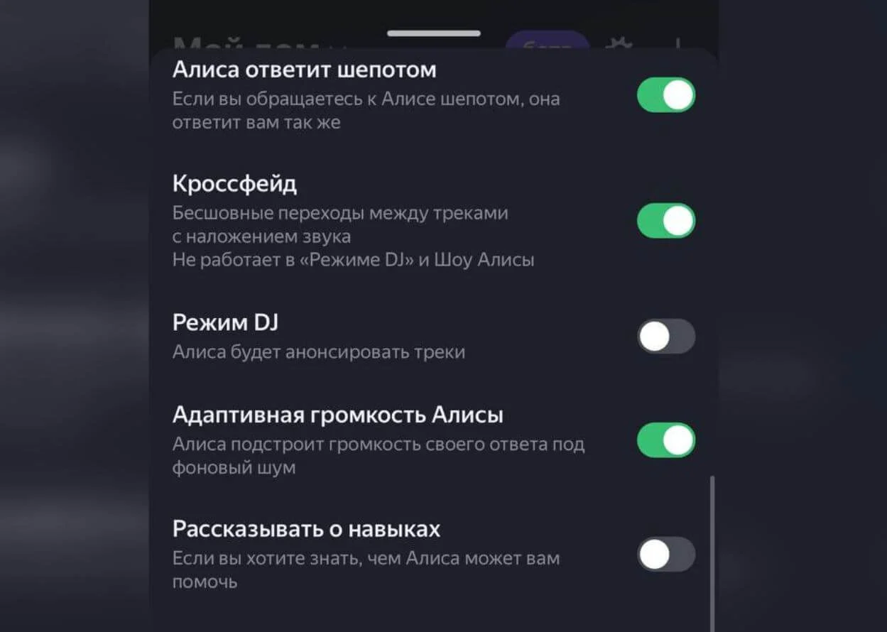 Первая опция — адаптивная громкость. Например, у вас громко играет музыка или дома шумно по другим причинам. В этом случае Станция заметит это и громко ответит на запрос. Или наоборот — если в комнате тихо, то колонка ответит тихо. Включить опцию можно в настройках приложения «Дом с Алисой» (на скриншоте ниже).