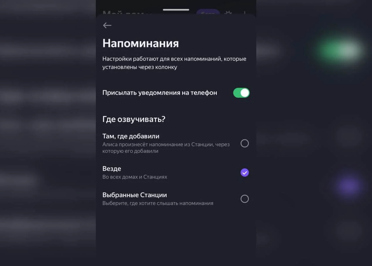 В настройках нужно зайти в раздел «Виртуальный ассистент», затем перейти в «Напоминания» и перевести ползунок «Присылать уведомления на телефон» в активное положение.