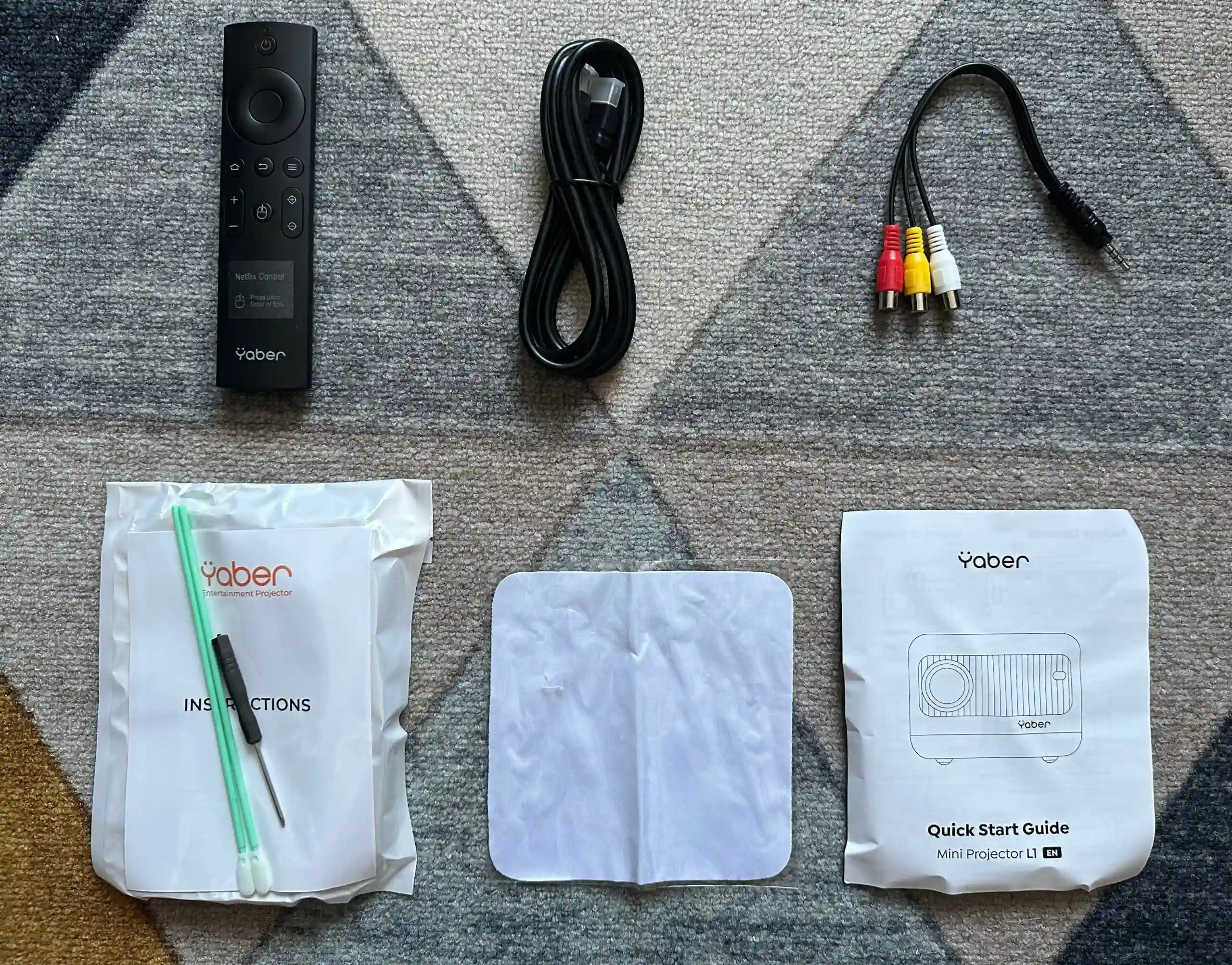 Проектор Yaber L1 приехал в небольшой коробке. Кроме самого устройства здесь были провода для подключения к сети, кабель HDMI, беспроводной пульт, комплект для очистки линзы с салфеткой. Настраивается проектор максимально просто — его нужно разместить напротив ровной стены, подключить к розетке и нажать на кнопку включения на верхней части. Выключается он двойным нажатием на ту же кнопку или по таймеру.