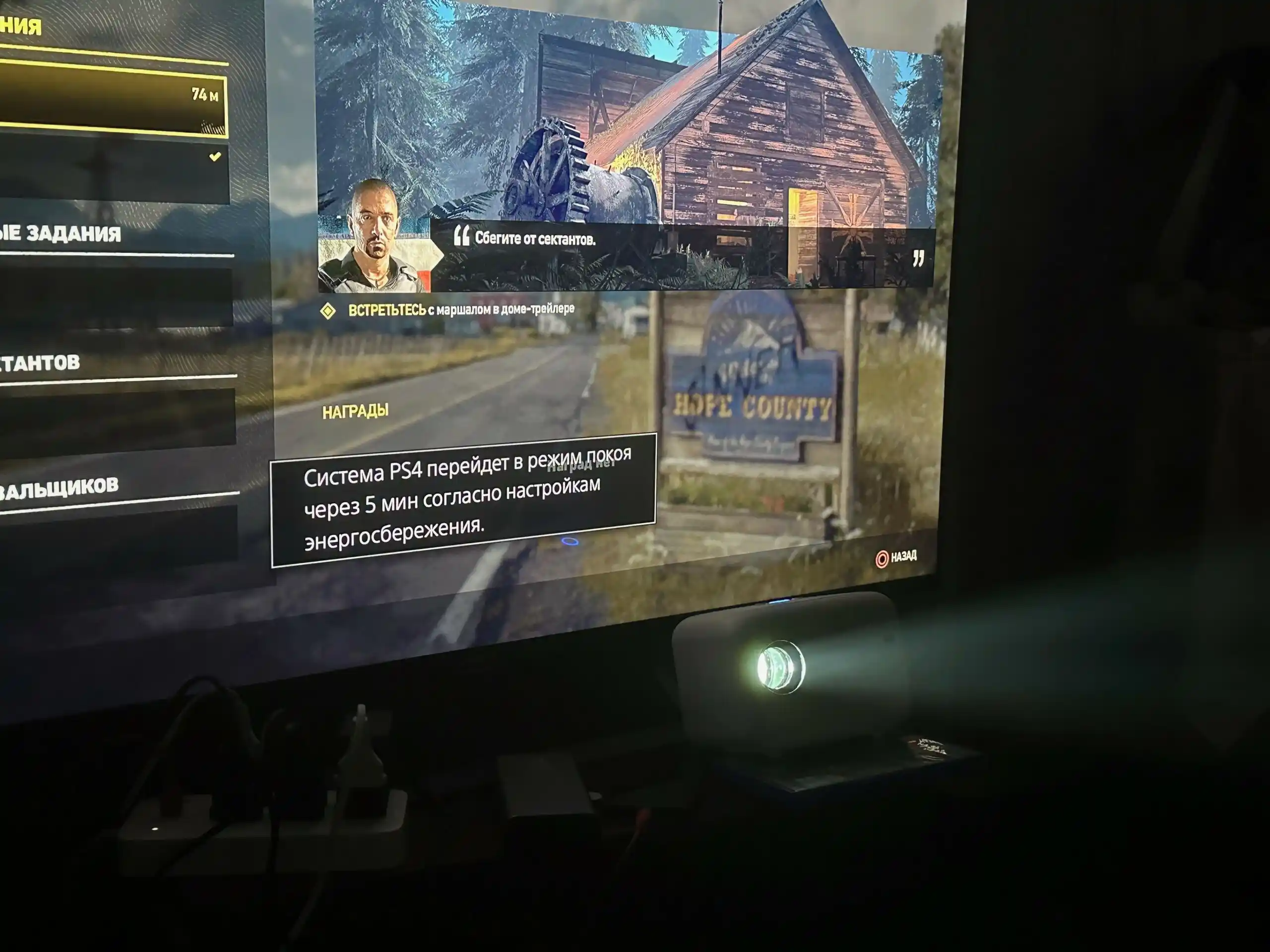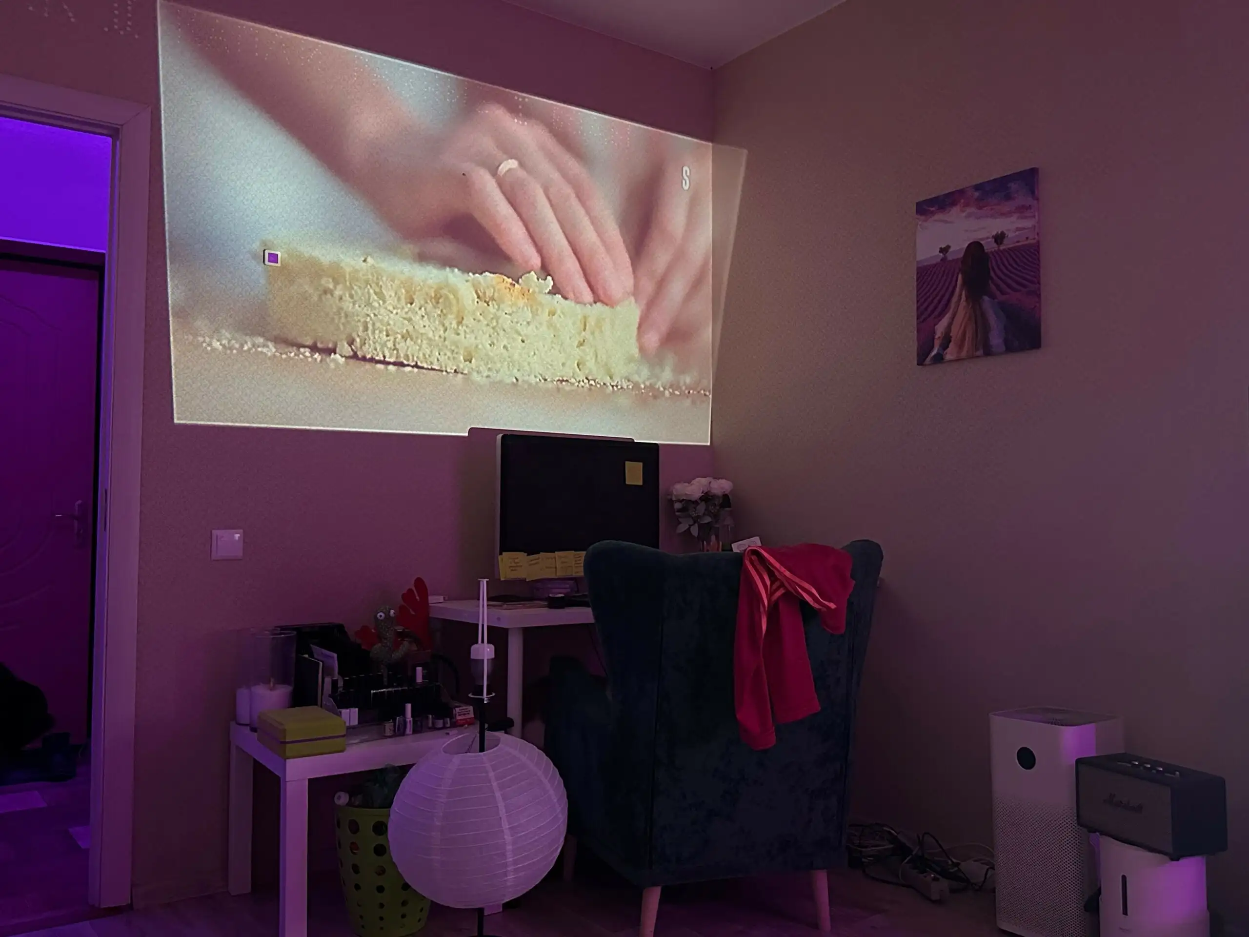 Моя девушка иногда жалуется, что не может уснуть ночью, если я сажусь за приставку. С проектором этой проблемы нет, потому что его яркость намного ниже, чем у телевизора. Свет от стены почти не отражается, поэтому с этим устройством можно сидеть ночью и никому не мешать. Кстати, играть на нем тоже пробовал. С одной стороны, никакой проектор не заменит качественный 4К-телевизор. С другой, пройти GTA V, Cyberpunk 2077, зарубиться в FIFA на экране во всю стену — это особый кайф. Можно сделать скидку на качество картинки.