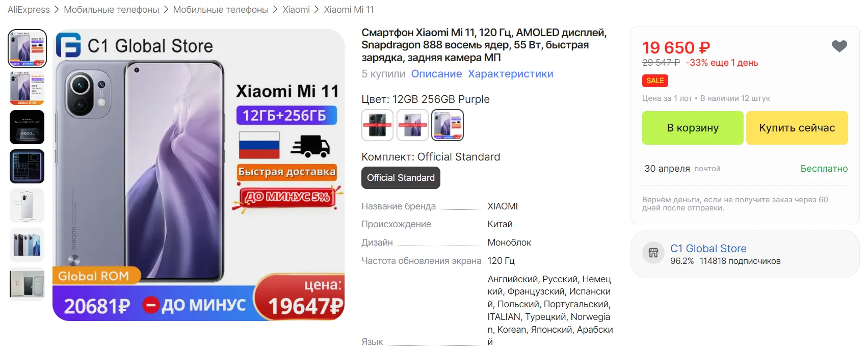 Xiaomi Mi 11 выпустили очень давно, еще в начале 2021 года. С того момента многое поменялось — например, компания избавилась от частицы «Mi» в названиях смартфонов. «Одиннадцатый» пропал из продажи практически сразу после выхода 12-го поколения, но почему-то вновь вернулся на Али спустя три года после релиза.