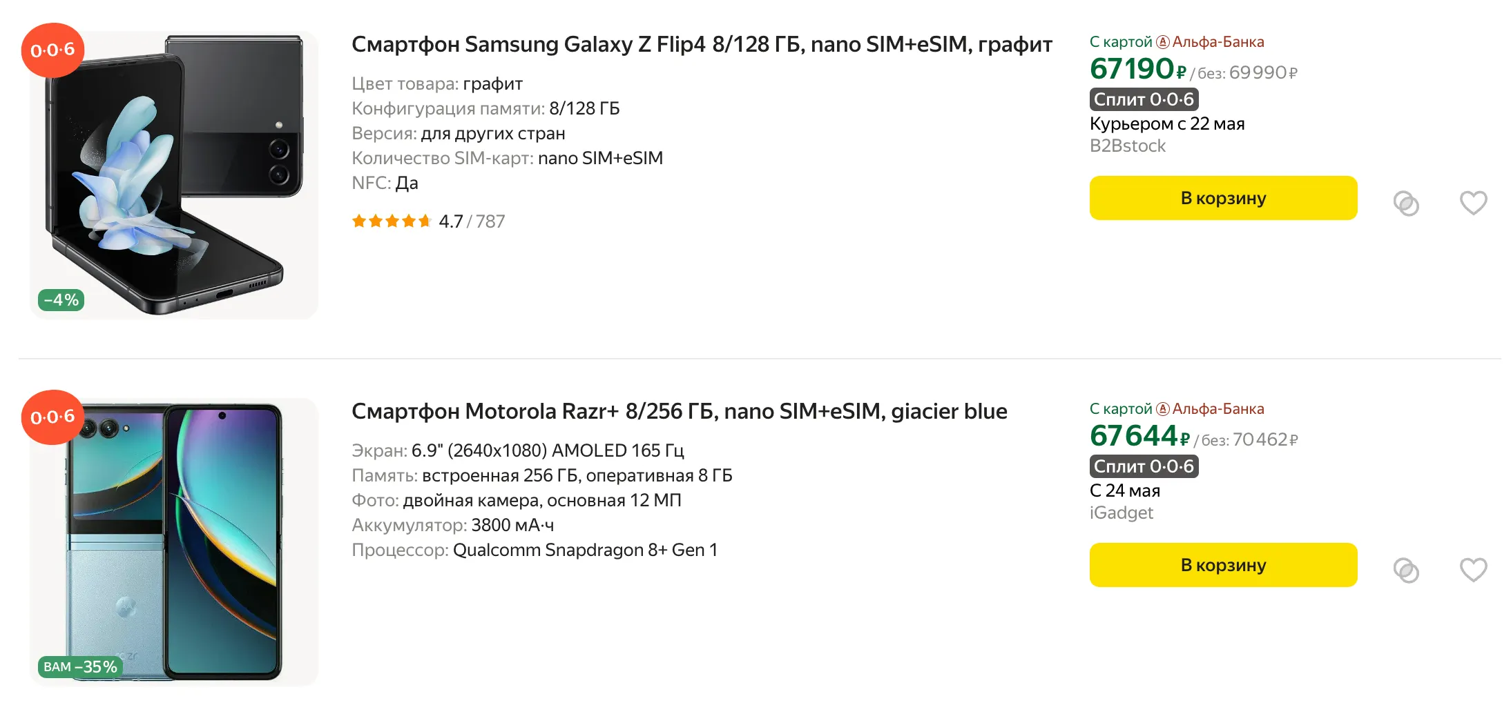 Мы проверили Маркет и обнаружили, что смартфоны лидера отрасли Samsung, Huawei, Honor, Motorola, Tecno стоят дороже. Например, также до 40К доступен Samsung Galaxy Z Flip3, но этот аппарат вышел 3 года назад. Huawei P50 Pocket обойдется минимум в 45 тысяч рублей, Motorola Razr+ доступен почти за 70К.