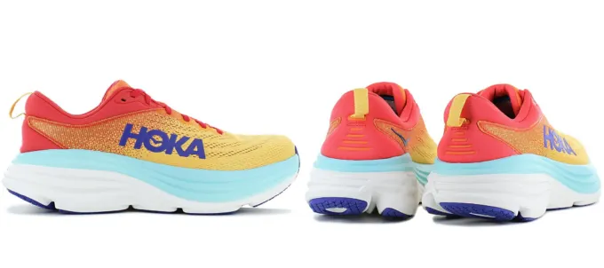 Что же с обувью? Первая пара – красно-желтые HOKA One One Bondi 8. И перед нами идеальная обувь для занятий спортом. Эти кроссовки славятся шикарной амортизацией – недаром их используют бегуны на длинные дистанции. Подошва сделана из дюрабразионной резины, а верх выполнен из дышащей сетки. Еще один важный момент – стелька Ortholite Hybrid, обеспечивающая дополнительную амортизацию.