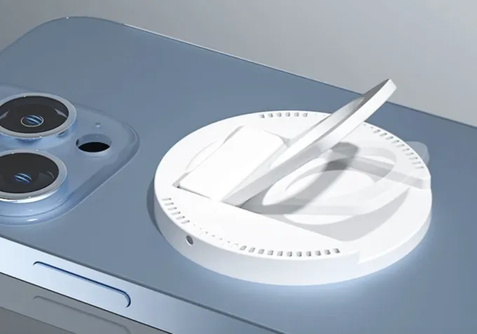 Это круглая штуковина из пластика, которая крепится на магнитах к задней панели смартфона. Во-первых, ее можно использовать как попсокет — то есть в качестве держателя для iPhone. Напомним, что он держится на магнитах, а не на клею, как другие попсокеты. «Магнит позволяет прокручивать аксессуар относительно корпуса и подбирать удобное положение для правой или левой руки», — отметили авторы.