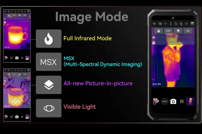Мощная фишка — наличие тепловизора Flir с разрешением 160 х 120 пикселей. По словам производителя, с его помощью можно обнаружить даже диких животных. Также он пригодится при строительстве или ремонте — например, когда нужно обнаружить утечку тепла при проектировании отопления.