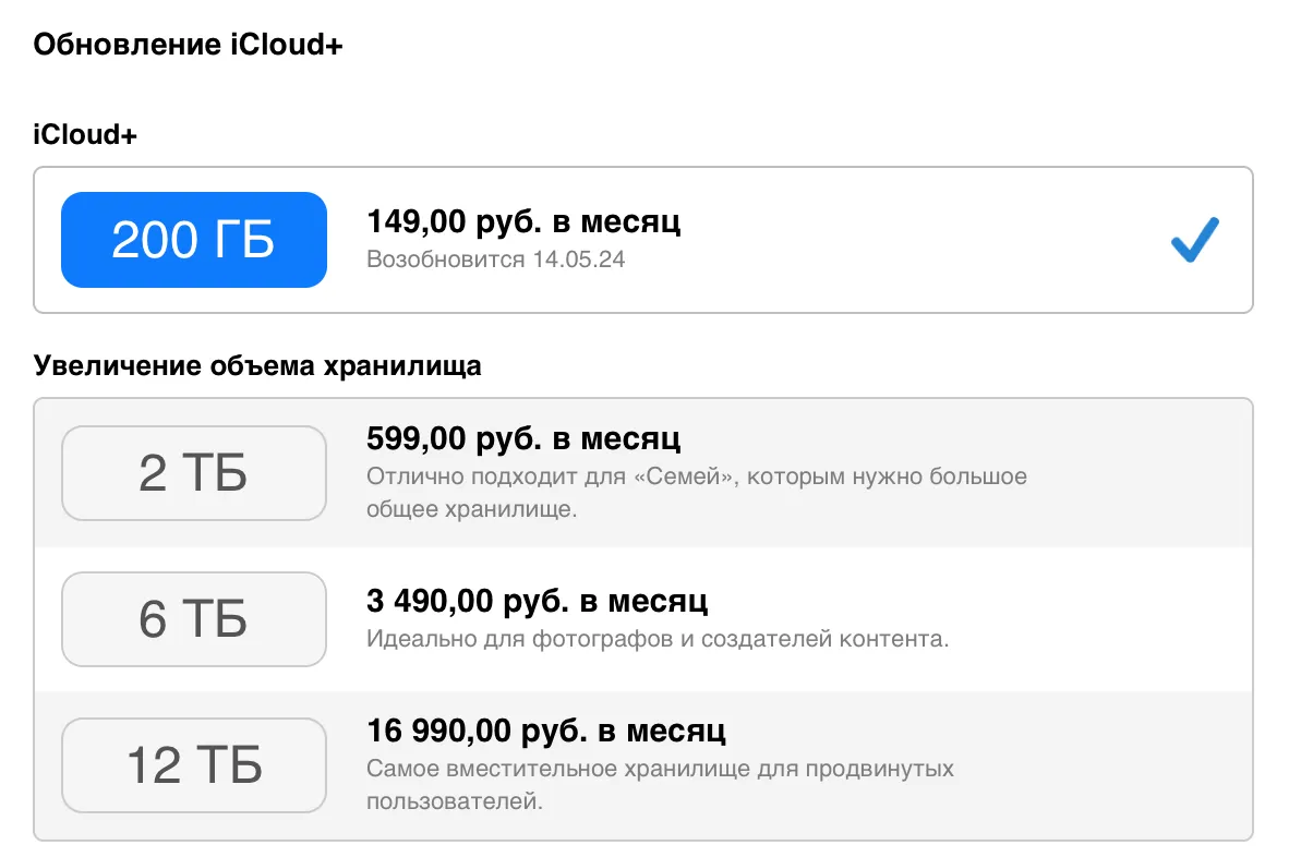 Еще можно пользоваться iCloud+ — подписки на 200 Гбайт за 149 рублей в месяц вполне хватит для одного человека. Или семейной группы, если люди будут аккуратно расходовать память.