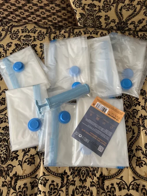Можно приобрести набор вакуумных пакетов за 1400 рублей. Принцип работы — кладете одежду, откачиваете воздух (насос в комплекте), закрываете клапан. За этот прайс предлагают 10 пакетов.