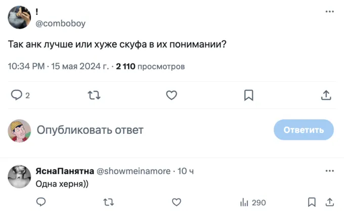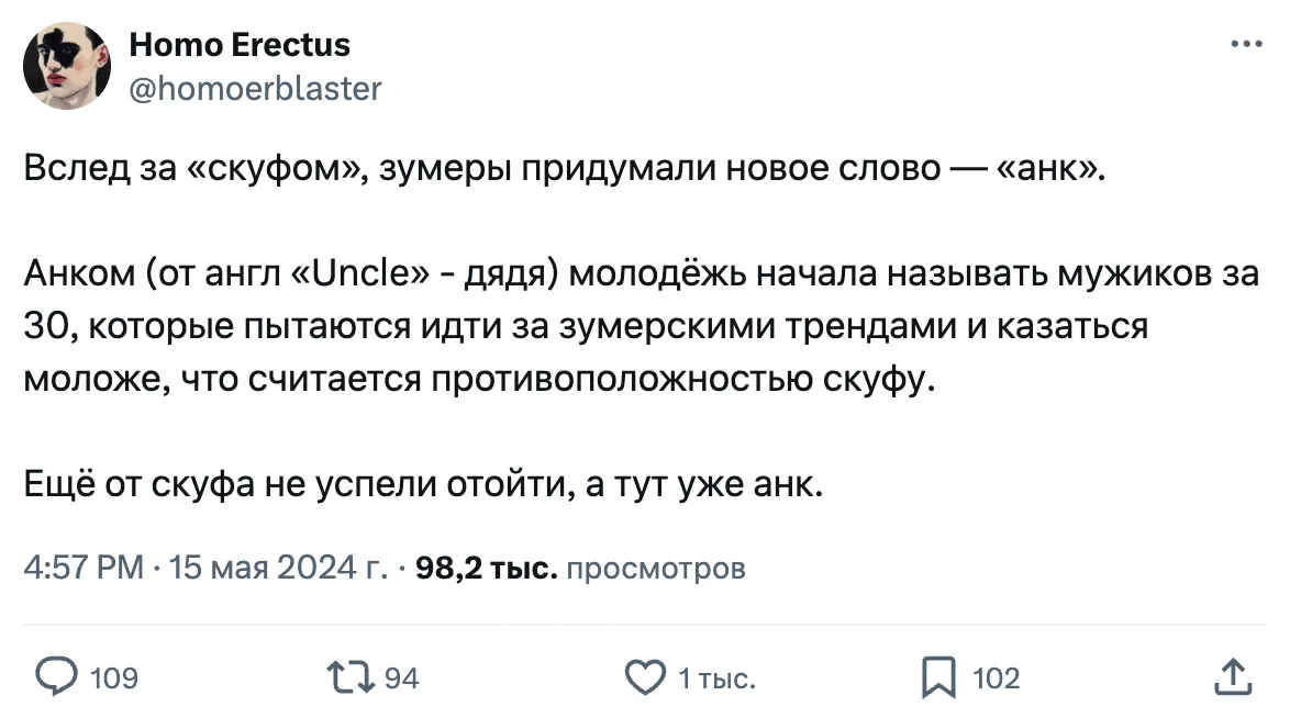 Очевидно, что многим мужчинам не нравится, когда их называют скуфами — как правило, так обозначают полных, неопрятных персонажей, обычно придерживающихся консервативных взглядов. Возможно, их порадует, что подростки придумали новое слово «анк» — оно обозначает молодящихся мужиков за 30, которые стремятся следовать трендам и не быть скуфами.