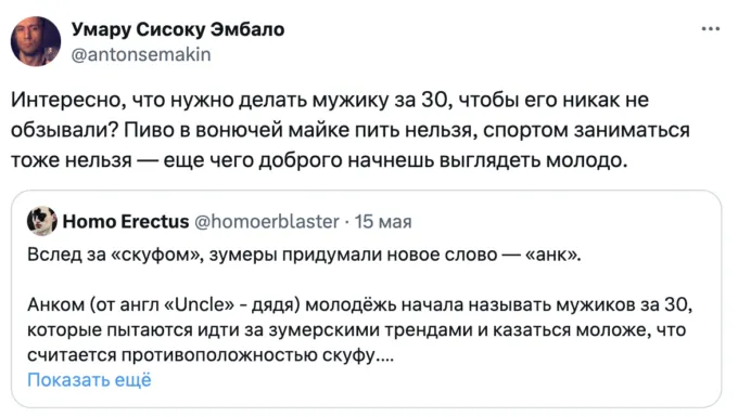 В интернете обсуждают новый типаж взрослых мужчин — анки. Как правило, это мужики старше 30 лет, которые пытаются казаться моложе и следовать трендам.