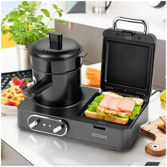 Плитка-гриль 4-в-1 от проверенного бренда Kitfort — один из немногих девайсов, которые за свою цену предлагают кучу функций. Зачастую производители техники от своей жадности стараются выпустить как можно больше устройств, чтобы вы скупили всё и обставили свою кухню. При этом их аппараты получаются довольно громоздкими. Тут мы имеем дело с компактной плитой со встроенной пароваркой, вафельницей, грилем и сэндвичницей. С такой штукой можно спокойно замутить полноценный обед с супом, котлетами, десертом и компотом.