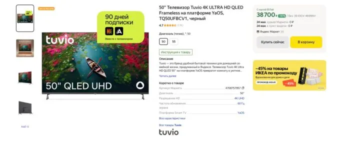 Заметили, что один из самых навороченных смарт-телевизоров от суббренда Яндекса, Tuvio, внезапно отдают с двойной скидкой на Маркете. Речь идёт о топовой модели с огромным 50-дюймовым QLED-экраном, поддержкой Алисы и полным набором умных функций. Обычно за неё просят около 46 тысяч рублей, но сейчас её можно приобрести всего за 39 тысяч и получить неплохой кэшбек.