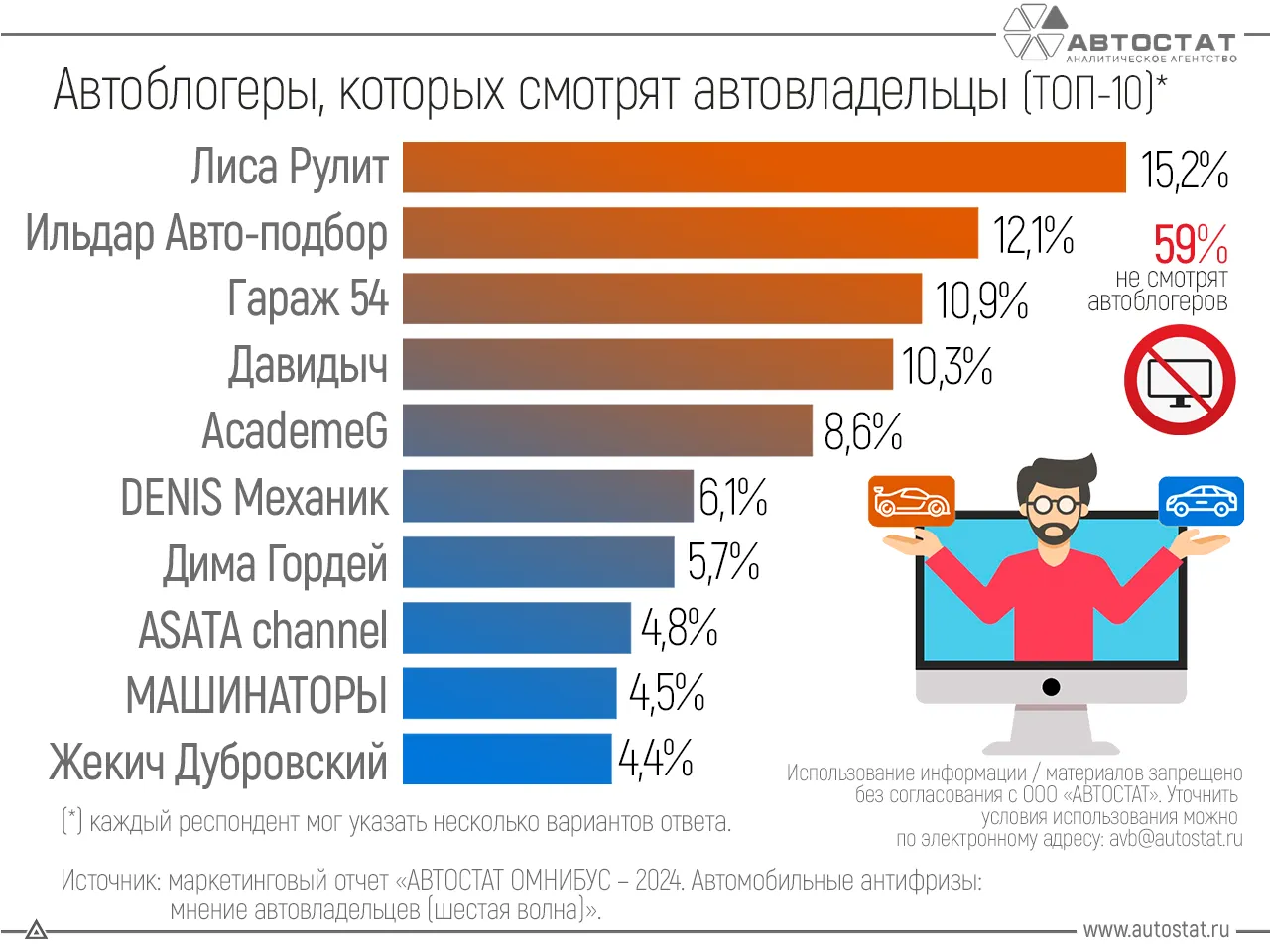 В «Автостате» уточнили, что в опросе участвовали 3100 автовладельцев, каждый мог выбрать несколько вариантов ответа. При этом 59% респондентов ответили, что не смотрят блогеров в принципе.