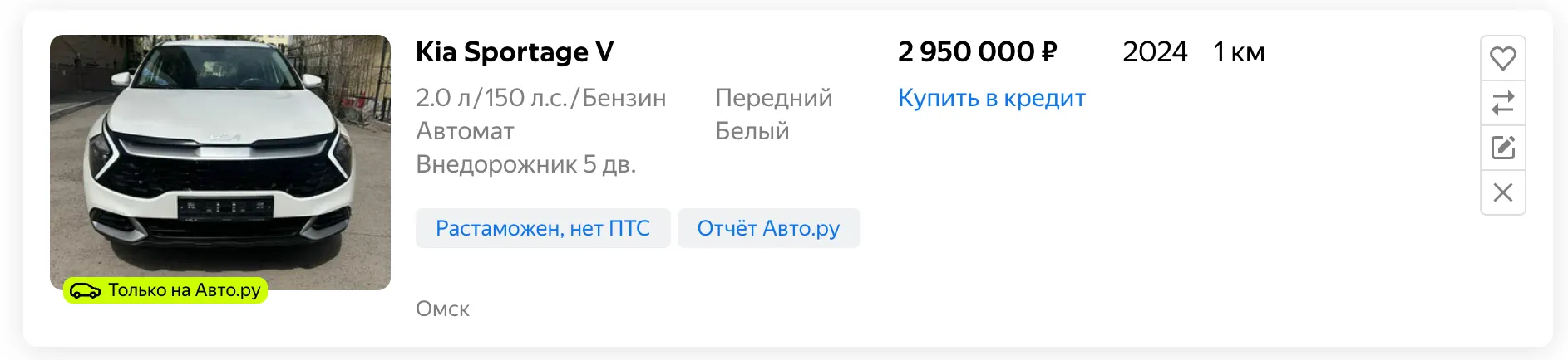 Sportage V поколения 2024 года выпуска имеет двухлитровый бензиновый турбомотор мощностью 150 л.с., полный привод и классический «автомат». Свежая машина поставляется в хорошей комплектации — есть камеры кругового обзора, климат-контроль, парктроники, круиз-контроль, датчик света и дождя, подогрев всех сидений.