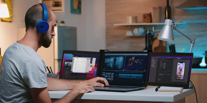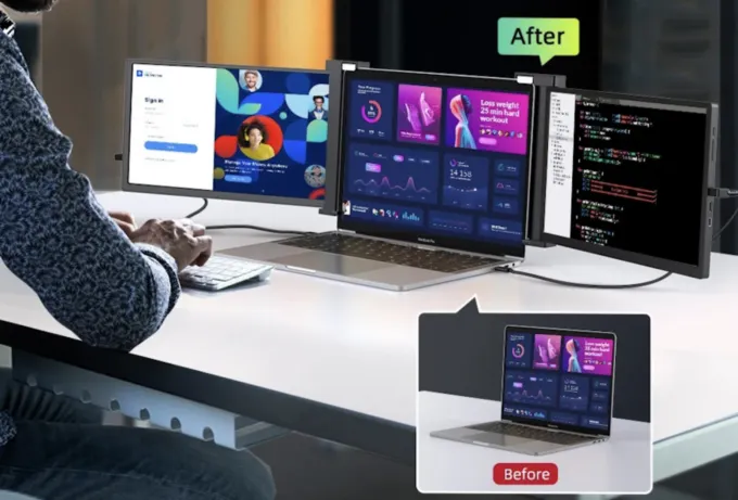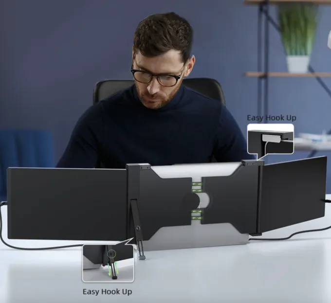 Конструкция аксессуара позволяет прикрепить его к практически любому ноутбуку. Затем нужно будет подключить устройство к компьютеру через разъем HDMI, питание происходит посредством USB-C. Каждый монитор (а их тут два) имеет диагональ 14 дюймов, разрешение Full HD и матовую матрицу.