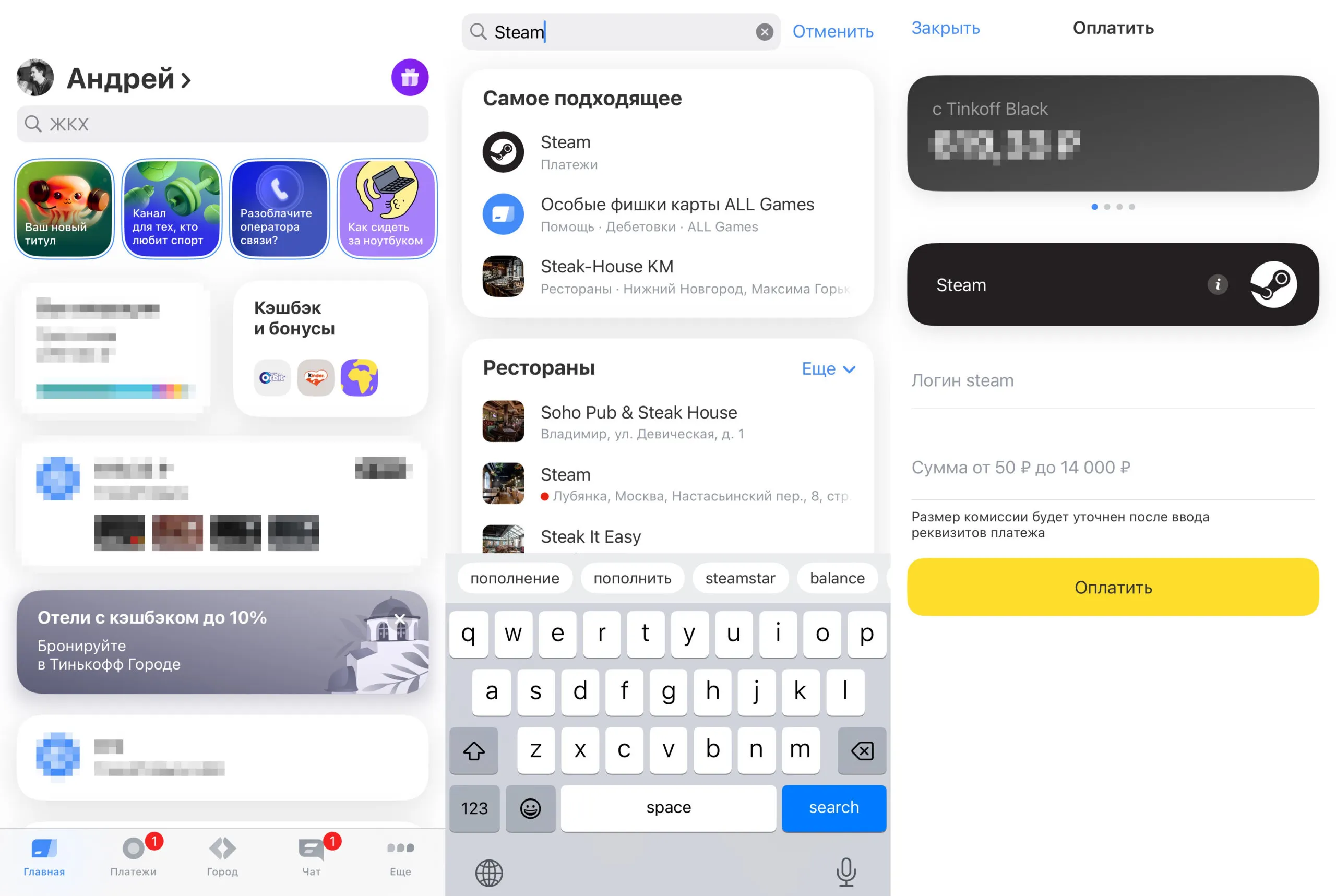 Чтобы положить рубли на счет Steam, нужно быть клиентом банка «Тинькофф». Открываем приложение, жмем на кнопку «Платежи», вводим в поиске Steam и попадаем в интерфейс пополнения.