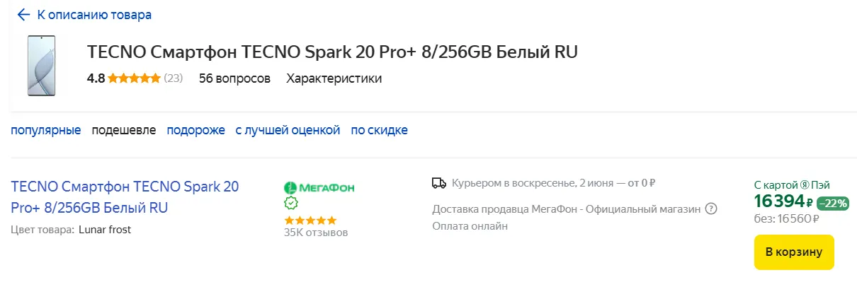Короче, спецификации классные — основным конкурентам «спарк» не уступает. Так как урвать его по лучшей цене? Все просто: ищете смарт на Маркете, среди всех расцветок выбираете «Lunar Frost» и добавляете в корзину лот от «Мегафона». Вот и все — можно оформлять заказ и забирать Tecno Spark 20 Pro+ за 16 560 рублей. А если оплатите товар фирменной картой «Пэй», сэкономите еще сильнее.