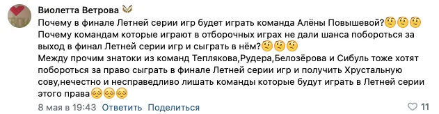 Но есть и странные изменения. В этот раз команды сразятся лишь за право участвовать в осенней серии. Все потому, что коллектив, который сыграет в финале летней серии и поборется за «Хрустальную сову», уже известен. Это команда Алены Повышевой.