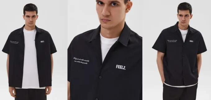 Начинаем с хлопковой черной рубашки от московского бренда FEELZ. Что мы видим? Стритстайл-айтем средней длины с классическим воротником, логотипом бренда и вдохновляющей надписью на английском языке. Минималистично и качественно. Цена – всего 5755 рублей.
