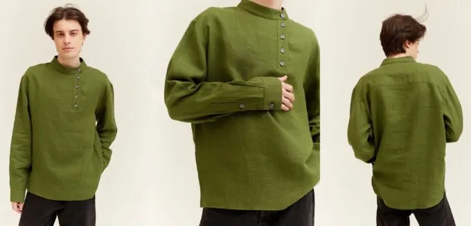 И вновь «Берегите птиц»! На этот раз с зеленой льняной косовороткой. Перед нами современное переосмысление традиционной русской рубашки. Это удобная и изысканная вещь, которая будет выделять вас из серой толпы. К тому же айтем устойчив к стирке и износу. Цена – 7019 рублей.
