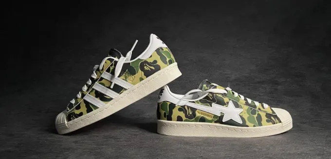 Ну, и куда же без сочнейших коллабораций? Третий пример – кроссовки adidas Superstar Bape ABC Camo Green. Это совместная работа немцев из adidas и японского стритвир-бренда Bape. Суперстары украшены нашивкой в форме звезды и выполнены в камуфляжной расцветке. Прикольный вариант на лето для настоящих коллекционеров. Цена – от 29099 рублей до 65836 рублей. Зато какая коллаба!