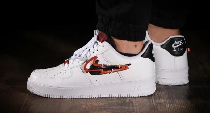 Второй пример – белые кроссовки Nike Air Force 1 Low Carabiner Swoosh Red. Эти кожаные форсы созданы для долгих прогулок, а украшением айтема становится съемный карабин в форме логотипа Nike. Можно снять фирменный Swoosh и дополнить дизайн обуви каким-нибудь другим элементом. Цена – от 17129 рублей до 24949 рублей. Опять же, все зависит от размера.