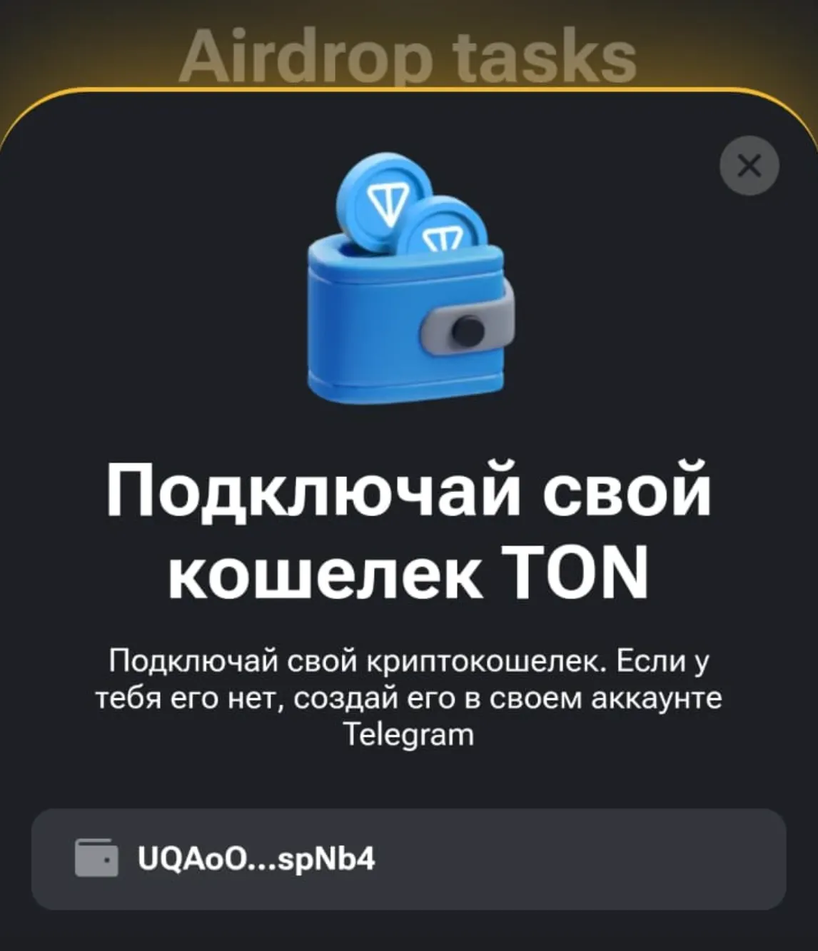 Если вы все сделали правильно, то в разделе Airdrop можно будет наблюдать окно с адресом TON-кошелька, а напротив задания появится галочка.