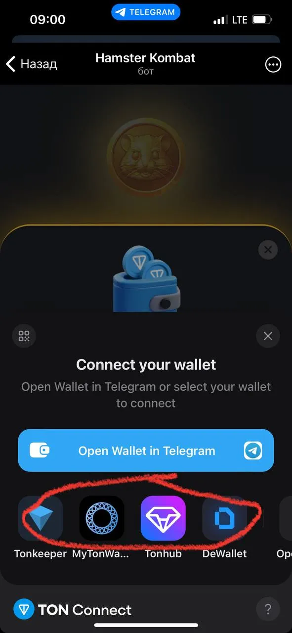 Что ж, мы находимся на этапе подключения кошелька к аккаунту в игре. Здесь нужно нажать на кнопку Open Wallet in Telegram и увидеть сообщение, что Hamster Kombat запрашивает доступ к кошельку. Соглашаемся, тем самым завершая подключение.