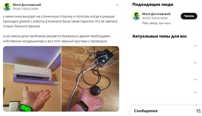 «Хоттейк в том, что я 1000 раз видел, что зимой мужики прогревают свои тачки через автозапуск, чтобы сесть уже в теплую. И ни разу не видел того, кто включает домашний кондиционер заранее на улице, чтобы войти в уже прохладную квартиру», – написал Достоевский.