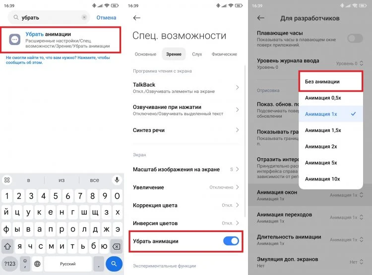 Еще специалисты советуют отключать анимацию интерфейса. Решение радикальное, но оно тоже поможет батарее. Заходим в настройки и переходим в нужный раздел через поиск (вводим запрос «Убрать анимации»).