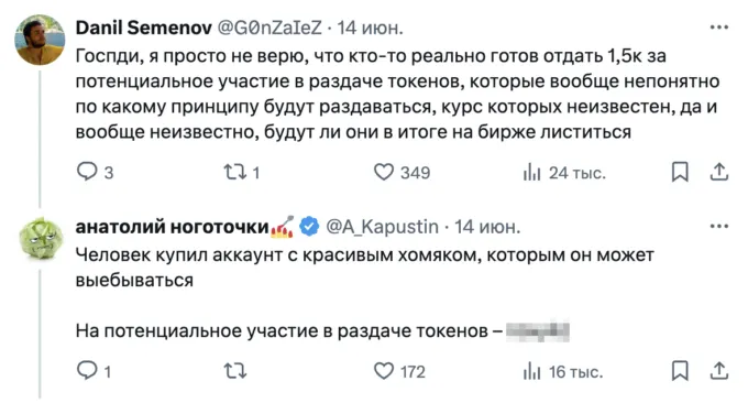 Подписчики в шоке — как можно отдать почти 1,5К евро за аккаунт в игре, которая еще и не факт что принесет деньги в виде криптовалюты в будущем? Анатолий отвечал возмущенным юзерам, что человеку был нужен просто крутой акк в игре, раздача токенов его не интересовала.