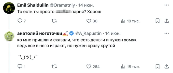 По словам Анатолия, сперва он купил у знакомого студента прокачанный аккаунт Hamster Kombat. «Хомяк» в профиле зарабатывал 1,5 млн монет в час — это отличный показатель. Покупка обошлась ему в 200 долларов (17 тысяч рублей). Затем блогер продал его человеку, который хотел «готовый крутой аккаунт хомяка, но не по кайфу чот там нажимать».